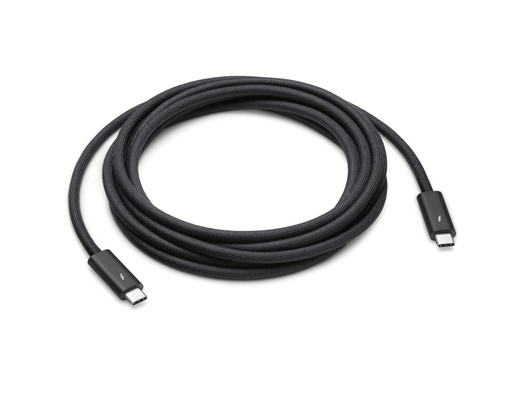 Kabel Thunderbolt 4 (USB-C) Pro (3m) Tenhle 3metrový kabel s černým opletením, které brání zamotání, podporuje přenosovou rychlost Thunderboltu 3, Thunderboltu 4 a USB 4 až 40 Gb/s, přenosovou rychlost USB 3 až 10 Gb/s, výstup videa přes DisplayPort (HBR3) a napájení příkonem až 100 W. K Macu s portem Thunderbolt 3 nebo 4 (USB-C) tímhle kabelem připojíš Thunderbolt (USB-C) a USB monitory a zařízení jako Studio Display, Pro Display XDR, doky nebo pevné disky. Tímhle kabelem taky připojíš iPhone 15 Pro k Macu. *Přenosy dat rychlostí až 40 Gb/s *Přenosy dat rychlostí USB 3.2 až 10 Gb/s *Výstup videa přes DisplayPort (HBR3) *Připojení k zařízením a monitorům s Thunderboltem (USB-C) a USB *Napájení příkonem až 100 wattů *Opletení usnadňuje smotání a brání zamotání *Aktivní kabel *Logo Thunderbolt na odlišení od jiných kabelů *Sériové zapojení až šesti Thunderbolt 3 zařízení