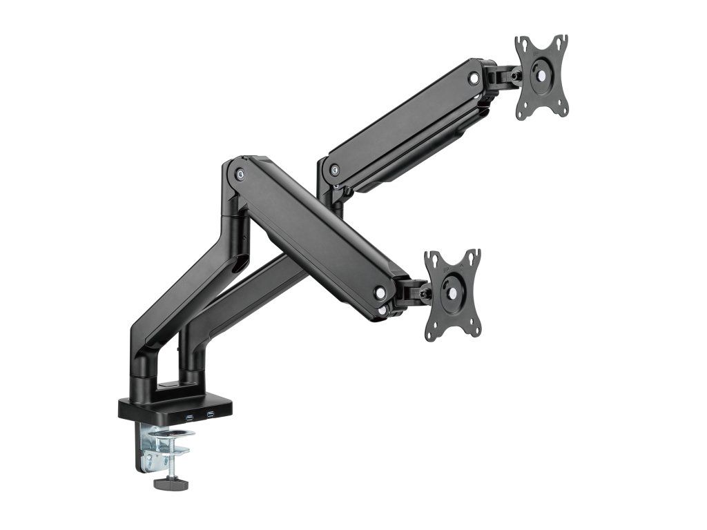 Díky odolné ocelové konstrukci poskytuje stabilní podporu pro dva monitory s úhlopříčkami 17" až 35" a hmotností až 16 kg. Flexibilní konstrukce pro dostatečné nastavení výšky a pozorovacích úhlů s možností nastavení orientace monitoru na výšku nebo na šířku. Součástí balení jsou průchodky a svorky pro instalaci na téměř jakoukoliv pracovní plochu. Odnímatelná deska VESA pro uživatelsky přívětivou instalaci.