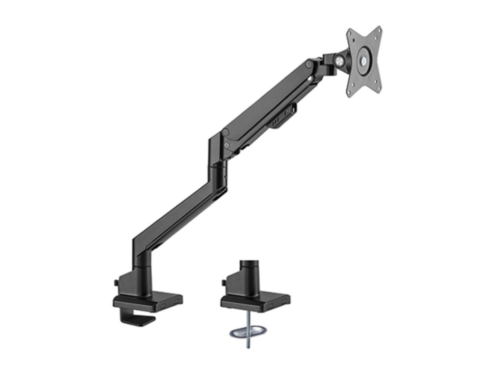 Díky odolné ocelové konstrukci poskytuje stabilní podporu pro jeden monitor s úhlopříčkou 17" až 32" a hmotností až 9 kg. Flexibilní konstrukce pro dostatečné nastavení výšky a pozorovacích úhlů s možností nastavení orientace monitoru na výšku nebo na šířku. Součástí balení jsou průchodky a svorky pro instalaci na téměř jakoukoliv pracovní plochu. Odnímatelná deska VESA pro uživatelsky přívětivou instalaci.