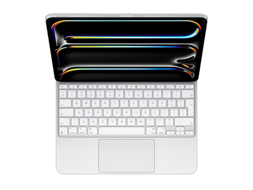 Magic Keyboard k 13palcovému iPadu Pro (M4) – anglický (mezinárodní) – bílý Magic Keyboard k iPadu Pro na pohodlné psaní a ovládání pomocí gest na trackpadu má nový elegantní design, hliníkovou dlaňovou opěrku a je krásně přenosný. Má řádek 14 funkčních kláves pro rychlý přístup k funkcím, jako je nastavování jasu displeje nebo ovládání hlasitosti, a USB-C konektor na průchozí nabíjení. Díky plovoucí konzolové konstrukci si hladce nastavíš ten správný pozorovací úhel. Nový, větší trackpad s haptickou odezvou je ideální na přesné úkony, jako je úprava tabulek nebo výběr textu. A podporuje ovládání iPadu známými, intuitivními Multi-Touch gesty. iPad Pro je v tomhle odolném krytu chráněný z obou stran, takže se s ním můžeš vydat kamkoli.