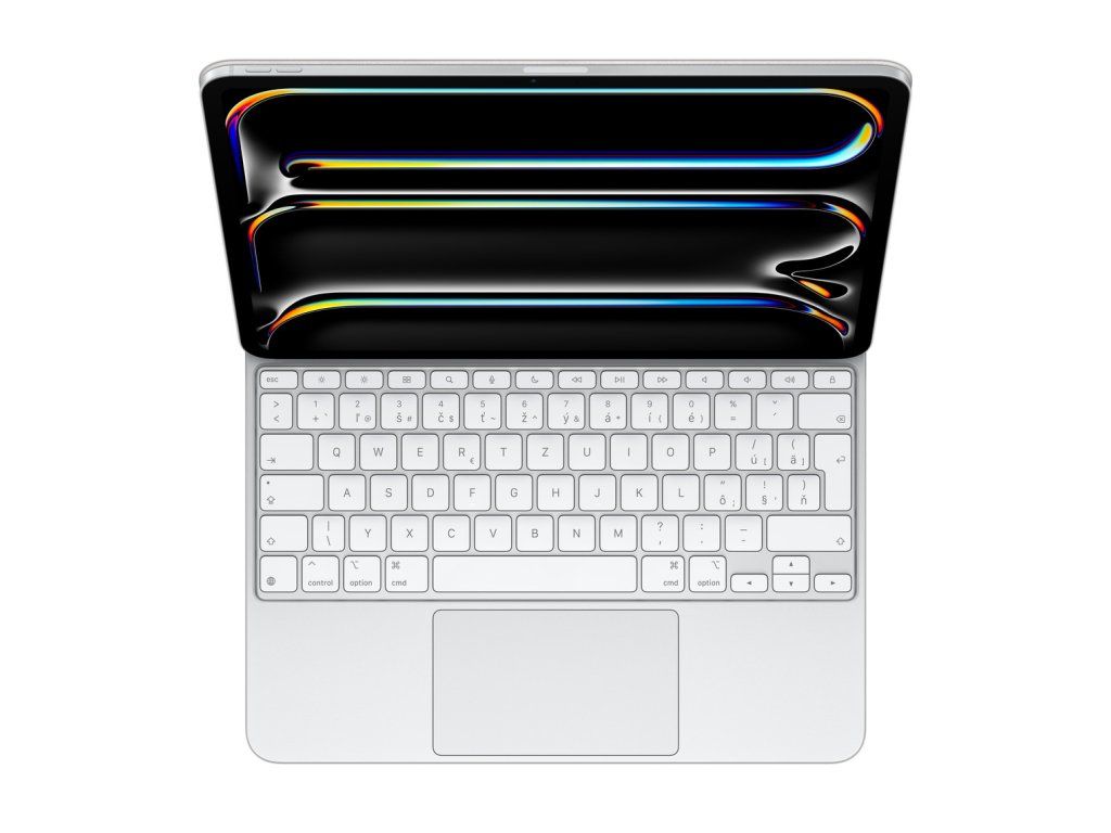 Magic Keyboard k 13palcovému iPadu Pro (M5) – slovenský – bílý Magic Keyboard k iPadu Pro na pohodlné psaní a ovládání pomocí gest na trackpadu má nový elegantní design, hliníkovou dlaňovou opěrku a je krásně přenosný. Má řádek 14 funkčních kláves pro rychlý přístup k funkcím, jako je nastavování jasu displeje nebo ovládání hlasitosti, a USB-C konektor na průchozí nabíjení. Díky plovoucí konzolové konstrukci si hladce nastavíš ten správný pozorovací úhel. Nový, větší trackpad s haptickou odezvou je ideální na přesné úkony, jako je úprava tabulek nebo výběr textu. A podporuje ovládání iPadu známými, intuitivními Multi-Touch gesty. iPad Pro je v tomhle odolném krytu chráněný z obou stran, takže se s ním můžeš vydat kamkoli.