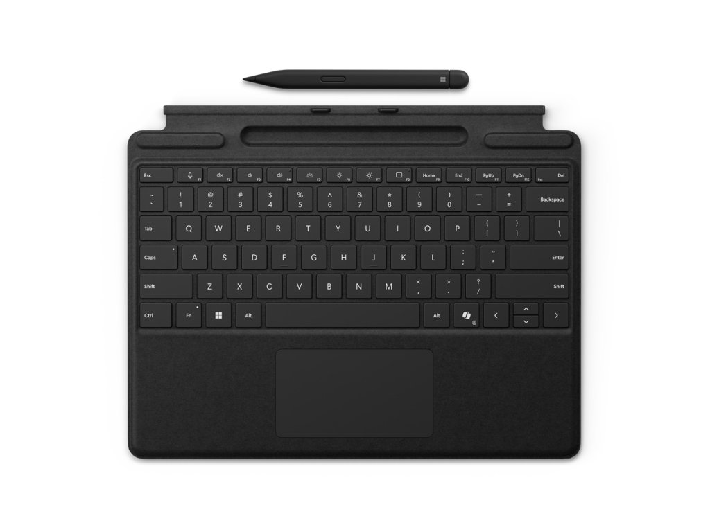 klávesnice Surface Pro s perem Slim Pen Posuňte všestrannost na novou úroveň s perfektní prémiovou klávesnicí s mechanickými a podsvícenými klávesami, která nabízí skleněný touchpad a zbrusu novou klávesu Copilot, abyste měli AI na dosah ruky. Díky integrovanému slotu Surface Slim Pen máte zajištěné bezpečné a snadné dobíjení.