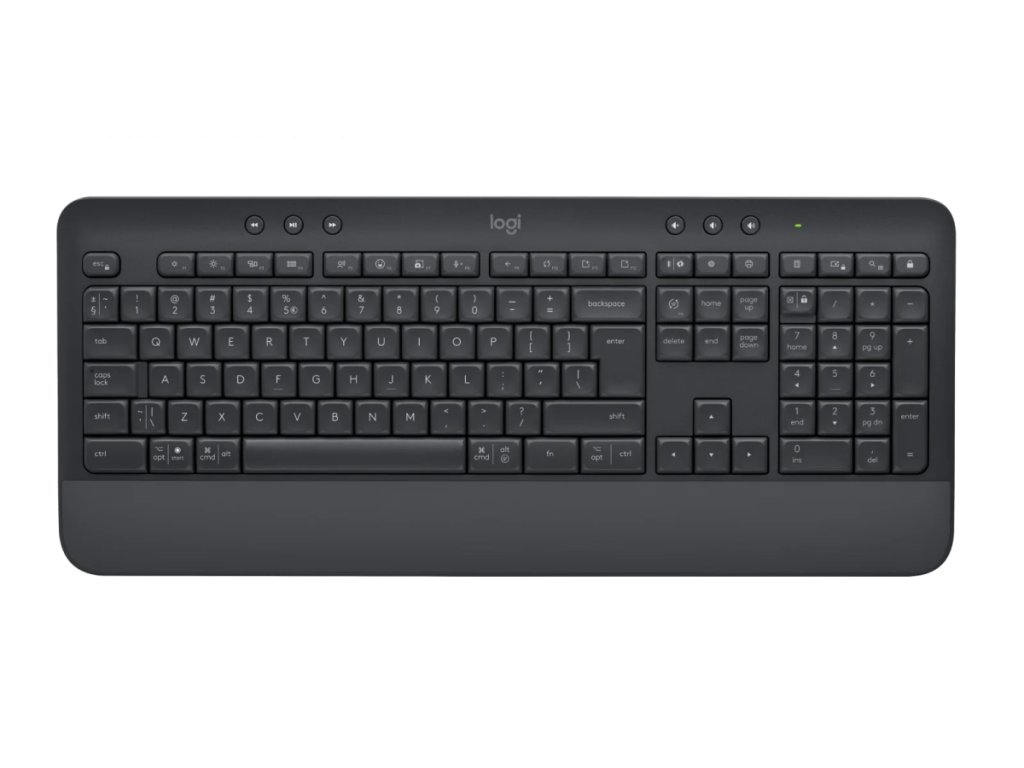 LOGITECH SIGNATURE K650 černá Bezdrátová klávesnice vybavená funkcemi pro každodenní práci a pohodlí. Klávesnice SIGNATURE K650 dokonale vyhoví vašim každodenním potřebám v práci díky vylepšeným zkratkám a integrované opěrce dlaně. Získejte pohodlí potřebné pro dlouhé hodiny práce u stolu. Díky provedení odolnému proti polití (až 60 ml), snadnému čištění a životnosti baterie 36 měsíců (Životnost baterie se může lišit v závislosti na uživateli a podmínkách používání) ji můžete pohodlně a snadno přenášet, aniž by vám překážely kabely.