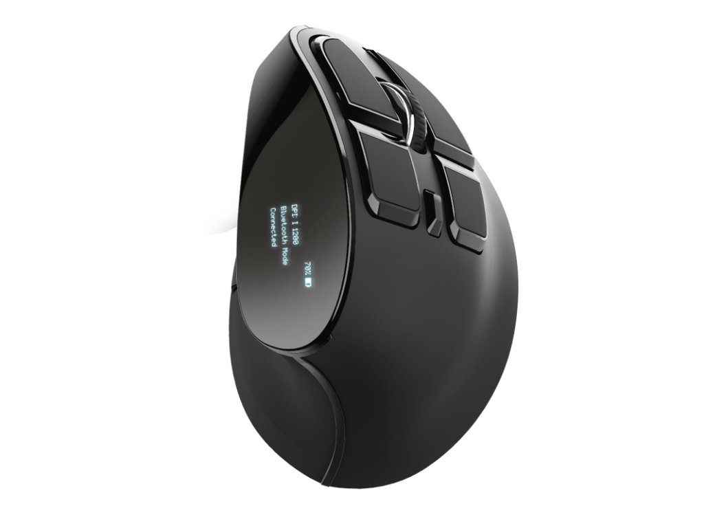 Klíčové vlastnosti *Ergonomický svislý design snižuje namáhání paží a zápěstí *LED displej zobrazuje stav baterie a připojení, bezdrátový režim a nastavení DPI *Optimalizujte svůj pracovní postup změnou přiřazení funkcí tlačítek prostřednictvím nabídky LED displeje *Lze použít přes USB nebo Bluetooth na vašem PC, notebooku, tabletu nebo smartphonu *Šetrné k životnímu prostředí, díky vestavěné dobíjecí baterii *9 tlačítek, včetně snadno přístupných bočních tlačítek ovládaných palcem (dopředu a dozadu) a horních tlačítek s extra úchopem *Perfektní ovládání kurzoru s nastavitelnou rychlostí (1200-1600-2000-2400 DPI)