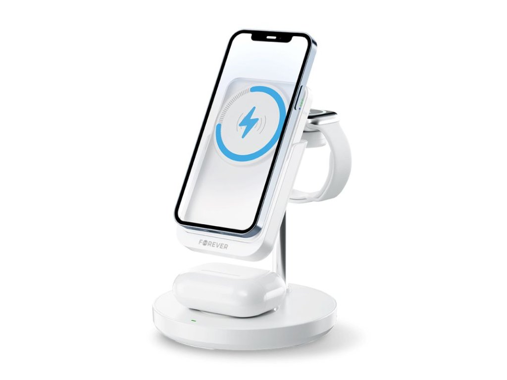 Magnetická bezdrátová nabíjecí stanice Forever 5v1 je univerzální nabíječka, která umožňuje nabíjet 3 zařízení současně. Její kompatibilita se systémem MagSafe a telefony podporujícími bezdrátové nabíjení zajišťuje bezproblémové nabíjení různých modelů zařízení. Navíc má vestavěný sloupek USB-A. Bonusem je vestavěná powerbanka s kapacitou 5000 mAh, kterou lze snadno odpojit a vzít s sebou, což zaručuje nezávislost a mobilitu v každé situaci. Poskytuje tak ideální řešení na cestách nebo v místech bez přístupu k elektrickým zásuvkám. Powerbanka má na boku zabudovaný indikátor nabíjení a větrací otvory určené k rozptýlení teploty vznikající při bezdrátovém nabíjení. Má také zásuvku USB-C, ze které podporuje 20W rychlé nabíjení. Powerbanka dokáže nabíjet také sluchátka AirPods pomocí funkce MagSafe. Navíc je vybavena praktickou nožičkou, která při nabíjení telefonu slouží jako stojánek, čímž dále rozšiřuje funkčnost tohoto zařízení. Součástí je také nabíječka kompatibilní s USB-C pro hodinky Apple Watch, kterou lze odpojit a vzít s sebou na cesty. Jedná se o praktické řešení, protože ji lze zapojit například do powerbanky a nabíjet hodinky kdekoli. Stanice se vyznačuje rychlým bezdrátovým nabíjením. Magnetické uchycení telefonu a opěrná noha zajišťují optimální polohu zařízení během nabíjení, což nejen usnadňuje proces, ale také zvyšuje pohodlí při používání.