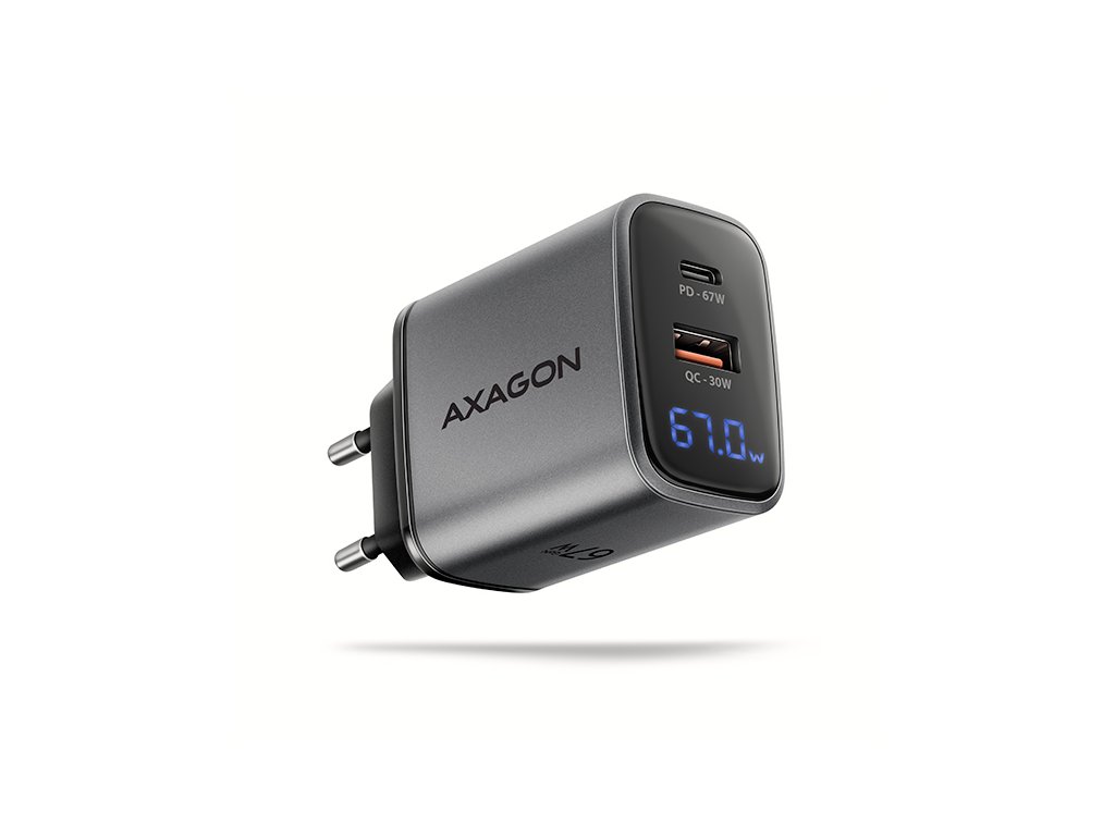 AXAGON ACU-PQ67D, GaN nabíječka do sítě 67W, výstup USB-A + USB-C, PD3.0/PPS/QC4+/SFC2.0/Apple, LCD