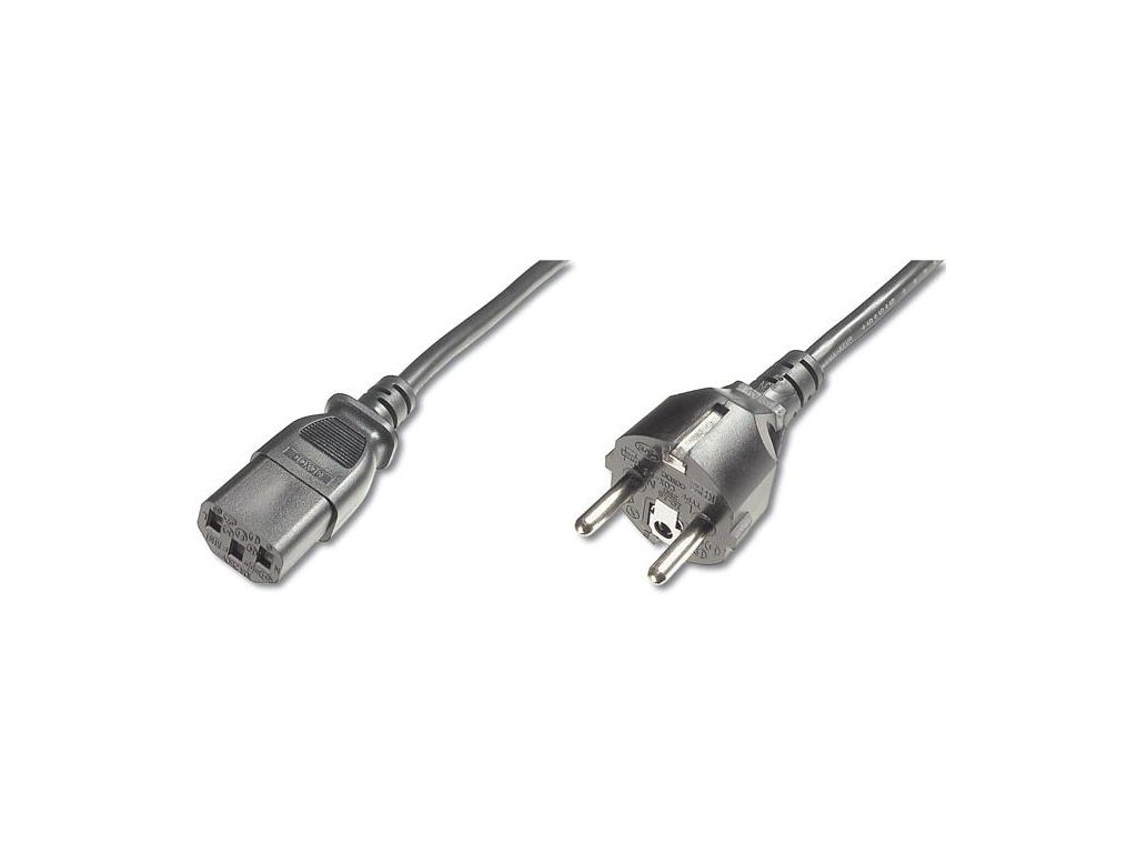 Napájecí kabel v černém provedení pro počítač nebo monitor. Třížilový kabel je zakončený standardní přístrojovou zástrčkou.