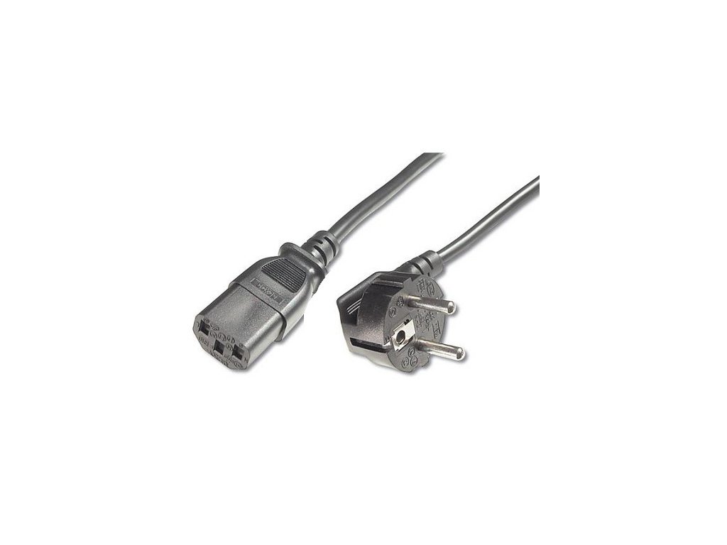Napájecí kabel v černém provedení pro počítač nebo monitor. Třížilový kabel je zakončený standardní přístrojovou zástrčkou.