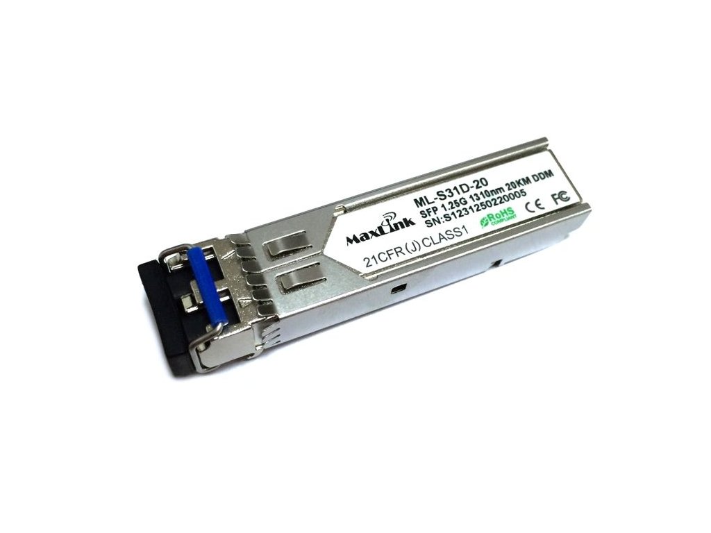 MaxLink 1.25G SFP optický modul, SM, 1310nm, 20km, 2x LC konektor, DDM ML-S31D-20 je 1.25G SFP modul s 1310nm vlnovou délkou, dvěmi LC konektory a maximální vzdáleností 20km po singlemode optickém vlákně. SFP modul podporuje monitoring, neboli DDM funkci. LC konektory v SFP modulu mají broušení typu UPC. Modul je kompatibilní se všemi aktivními prvky od MikroTiku a také se zařízeními jiných výrobců "cisco compatibile".