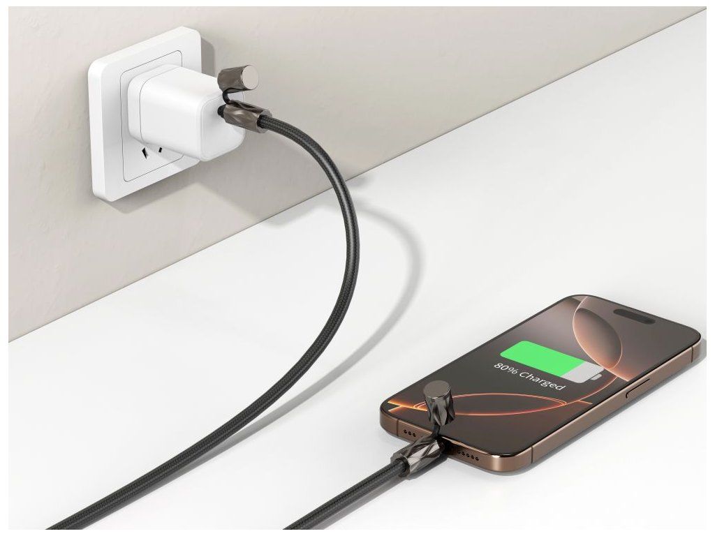 Tento popruh v sobě skrývá zabudovaný USB-C kabel s podporou rychlého nabíjení až 240W (PD), takže máte nabíjecí kabel vždy po ruce, aniž by zavazoval. Prémiové a designové zpracování kovových prvků ze zinkové slitiny a opletené šňůry o průměru 6 mm zajišťuje odolnost i elegantní vzhled.