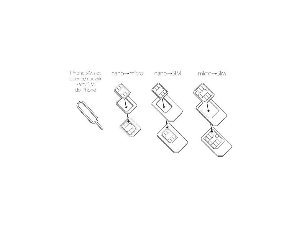 Sada SIM adaptérů Forever ve třech velikostech: micro SIM a 2x nano SIM. Umožňuje umístit kartu micro SIM (např. iPhone 4, 4S) a nano SIM (např. iPhone 5) na standardní SIM zařízení a nano SIM karty v zařízeních micro SIM.