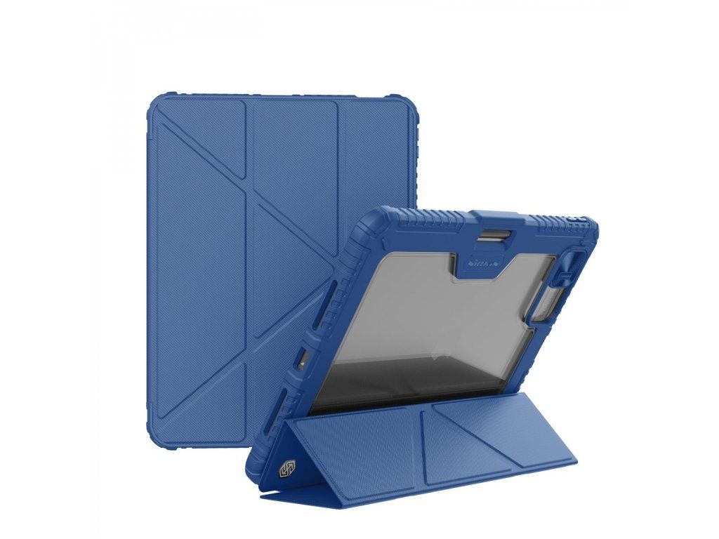 Nillkin Bumper PRO Protective Stand Case Multi-angle pro iPad Pro 12.9 2020/2021/2022/ Air 13 2024/2025 Sapphire Blue Nillkin Bumper Pro ochranné pouzdro s praktickým flipem, který slouží zároveň jako stojánek je vyrobeno z vybraného materiálu TPU a PC. Čočka fotoaparátu je chráněna posuvným krytem Zajišťuje dokonalou ochranu a funkčnost. Zesílené rohy perfektně ochrání hrany tabletu. Flip krytu je z PU kůže. Unikátní skládací kryt zobrazuje tablet ve všech zvolených úhlech pro psaní, čtení a prohlížení webu. Složení krytu je velmi jednoduché.