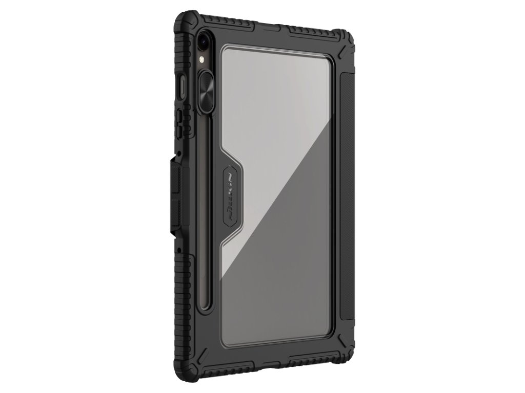 Nillkin Bumper PRO Protective Stand Case Multi-angle pro Samsung Galaxy Tab S9/S10 FE Black Nillkin Bumper Pro ochranné pouzdro s praktickým flipem, který slouží zároveň jako stojánek je vyrobeno z vybraného materiálu TPU a PC. Čočka fotoaparátu je chráněna posuvným krytem Zajišťuje dokonalou ochranu a funkčnost. Zesílené rohy perfektně ochrání hrany tabletu. Flip krytu je z PU kůže. Unikátní skládací kryt zobrazuje tablet ve všech zvolených úhlech pro psaní, čtení a prohlížení webu. Složení krytu je velmi jednoduché.