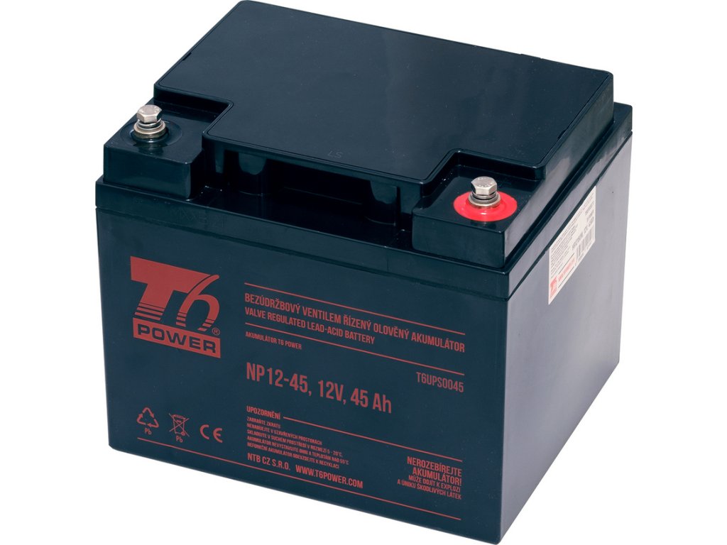 Akumulátor T6 Power NP12-45 je speciálně navržen pro zařízení s vysokou zátěží. Skvěle se hodí pro napájení UPS, elektromotorů, datových center, telekomunikačních zařízení, apod. Tento bezúdržbový ventilem řízený olověný akumulátor disponuje kontakty T14, M6.