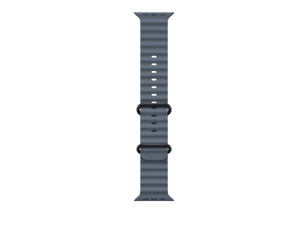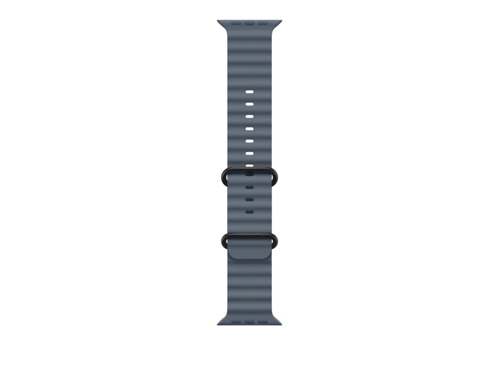 49mm ocelově modrý Oceánský řemínek – provedení z černého titanu Oceánský řemínek je lisovaný z vysoce funkčního elastomeru a má trubicovitou strukturu, takže se dá napnout, aby perfektně seděl i přes neopren. Díky titanové přezce a nastavitelnému poutku, které jsou přirozeně odolné proti korozi, se při vysokorychlostních vodních sportech ani nehne. Pokud řemínek nenavlékneš přes neopren, můžeš si dokoupit prodloužení.