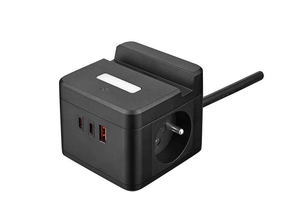 Síťový adaptér • rozbočovač • zásuvka • držák mobilního telefonu • 2 x AC (230V) výstup • 1 x USB-A (5V/3A, 9V/2A, 12V/1,5A) • 2 x USB-C (5V/3A, 9V/2,22A, 12V/1,67A) • dotykové světlo se třemi intenzitami svícení • kompaktní rozměry a design • kabel 1,4 m • možnost nabíjení až 5 zařízení současně