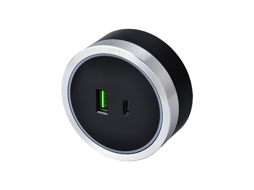 Zásuvkový modul Viking A60 Objevte moderní zásuvkové lišty a moduly značky VIKING, které se vždy přizpůsobí každému detailu vašeho prostoru. Vyberte si délku zásuvkové lišty, barvu a typ zásuvek a sestavte si dokonalé řešení na míru. Zásuvkové moduly v lištách můžete kdykoli libovolně měnit a přizpůsobovat podle vašich aktuálních potřeb. Zásuvkový modul Viking A60 je vybaven jedním USB-A výstupem (5V/2,4A) a jedním USB-C výstupem (5V/3,6A, PD) a je k dispozici ve třech barevných variantách. Zásuvkový modul Viking A60 v stříbro-černé variantě je vybaven kruhovým LED indikátorem, který po připojení do elektrické sítě svítí modře.
