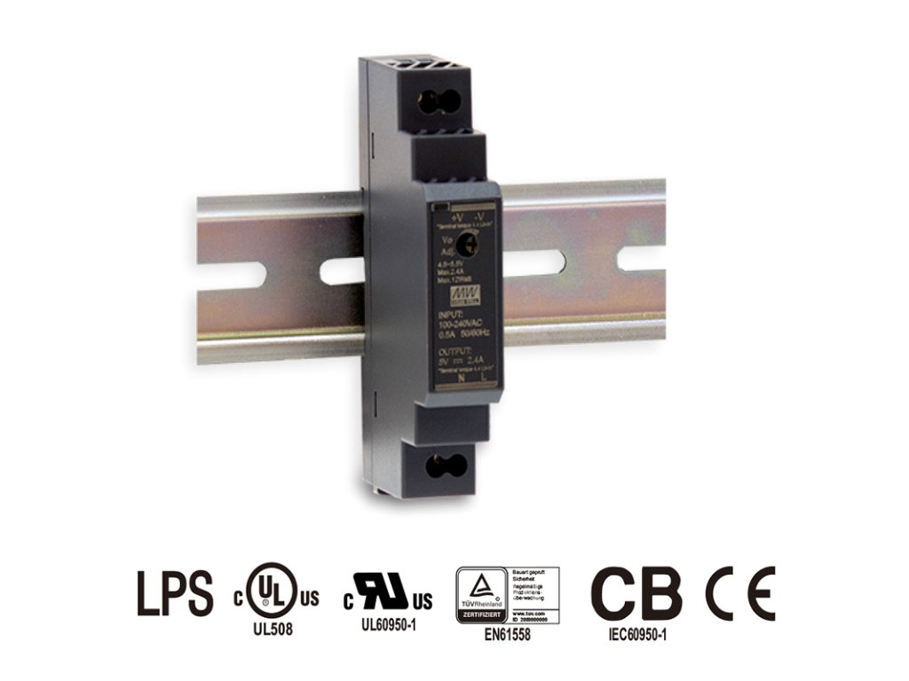 Zdroj na DIN lištu, Inovovananá modelová řada DR-x-x, menší rozměry. Je vhodný pro použití v průmyslových i domácích kontrolních systémech, automatizaci budov, automatizaci výroby a elektromechanických přístrojích. Výkon: 12W Výstupní napětí: 5V Výstupní proud: 2,4A Univerzální vstup: 85 ~ 264VAC, 120 ~ 370VDC Ultra tenký design o šířce 17,5mm Spotřeba při běhu na prázdno < 0,3W Izolační třída II LPS Pasivní chlazení Nastavitelné DC napětí na výstupu Určen pro DIN lištu TS-35/7,5 nebo 15 LED indikátor provozu Účinnost: 80% Provozní teplota: -30 ~ +70°C MTBF: 1166K hod. Rozměry: 17,5 x 90 x 54,5mm Hmotnost: 78g Typy ochrany: protizkratová, proti přetížení, přepěťová
