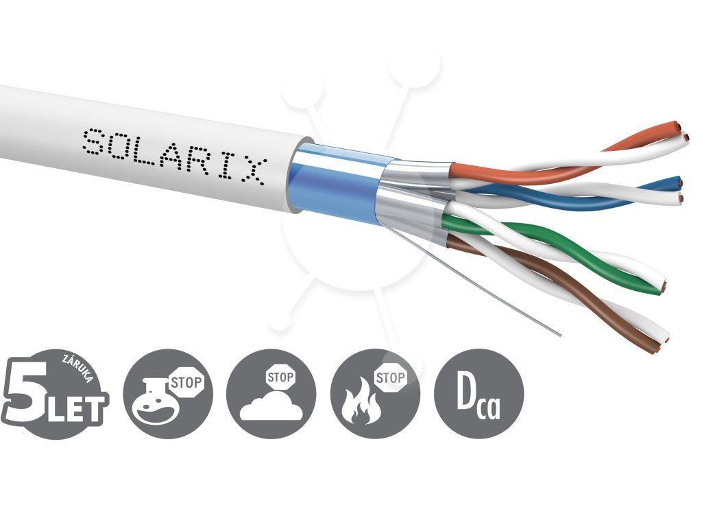 Instalační kabel Solarix s označením SXKD-6A-FFTP-LSOH je vysoce kvalitní dvakrát stíněný kabel kategorie 6A, který je určený pro provoz vysokorychlostních ethernetových protokolů, včetně 10GBASE-T. Konstrukce kabelu je F/FTP, typ pláště LSOH s třídou reakce na oheň Dca-s2,d2,a1. Vodiče kabelu jsou vyrobeny z kvalitního měděného drátu s čistotou mědi 99,97 %. Kabel bez problémů splňuje požadavky z mezinárodních standardů ISO/IEC 11801, EN 50173 a ANSI/TIA 568.2-D. V případě CPR (nařízení EU č. 305/2011) je kabel testován u nezávislé laboratoře FORCE TECHNOLOGY v systému posuzování vlastností AVCP 3. Stejně jako ostatní kabely Solarix, je i kabel SXKD-6A-FFTP-LSOH značen metráží po 1 m v rozsahu od 0 do 500 m. Kabel je dodáván na vysoce pevné dřevěné cívce, na které jsou uvedeny všechny nezbytné produktové informace, včetně čárových kódů, výrobní šarže, popisu a nejdůležitějších technických parametrů.