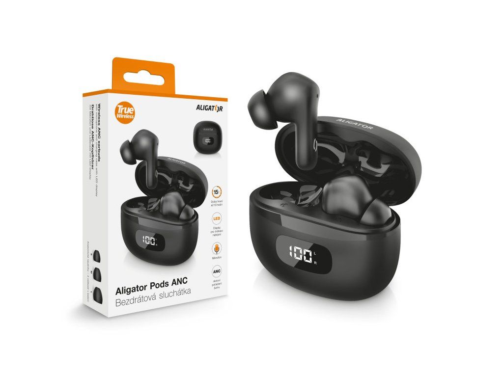 Obsah balení: *Bluetooth sluchátka Aligator Pods ANC *Nabíjecí pouzdro s LED displejem *Nabíjecí USB-C kabel *3 velikosti náušníků *Návod k použití