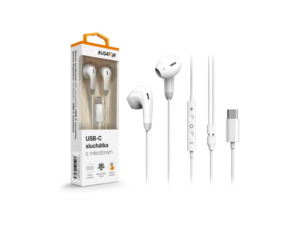 Sluchátka ALIGATOR AE007 Cool Music, USB-C, bílá Stereo sluchátka s hands-free AE007 splňují náročné parametry nejen, pokud jde o kvalitu zvuku, ale také svým dinamickým provedením. Obsahují vestavěný mikrofon a ovládací tlačítko. Připojení pomocí USB-C konektoru. Moderní uzavřená konstrukce a krystalicky čistý poslech. Příjemně překvapí i náročnější posluchače, kteří hledají sluchátka pro kvalitní poslech hlubokých tónů i čistých výšek. Skvělý poměr mezi kvalitou a cenou ocení i nároční uživatelé. Jednoduchý ovladač umožňuje přijmout nebo odmítnout hovor *Frekvence: 20Hz-20KHz *Impedance: 32 Ohm *Citlivost: 102dB ± 3dB *Vstup: USB-C konektor *Délka kabelu: 1.2m *Kvalitní mikrofon