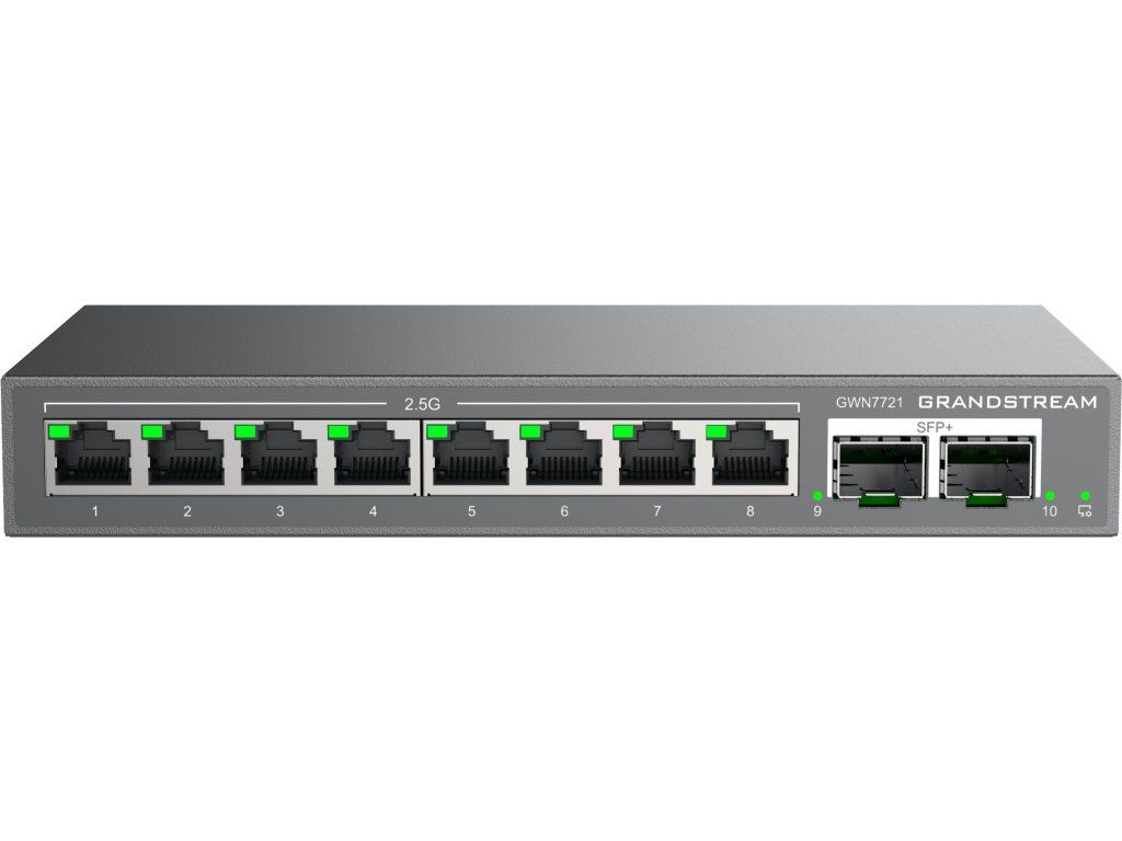 GWN7721 je 10portový managovatelný switch L2 Lite, vybavený 8x 2,5G ethernetovými porty a 2x 10gigabitovými SFP+ porty, vhodný pro malé a střední podniky pro budování škálovatelných, bezpečných a inteligentních sítí.
