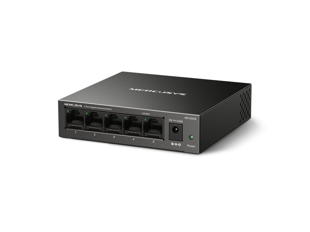 Mercusys MS105GS 5portový gigabitový stolní přepínač Kompaktní a spolehlivý gigabitový přepínač, který představuje ideální způsob, jak snadno rozšířit vaši kabelovou síť. S pěti vysokorychlostními porty je perfektním řešením pro rychlé připojení herních konzolí, chytrých televizorů nebo počítačů v domácnosti i malé kanceláři.