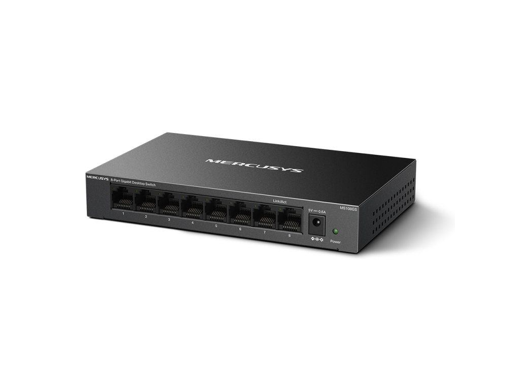 Mercusys MS108GS 8portový gigabitový stolní přepínač Kompaktní a spolehlivý gigabitový přepínač, který představuje ideální způsob, jak snadno rozšířit vaši kabelovou síť. S osmi vysokorychlostními porty je perfektním řešením pro připojení herních konzolí, chytrých televizorů, počítačů nebo tiskáren v domácnosti i malé kanceláři.