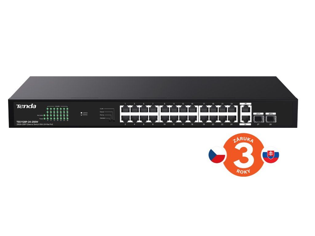Tenda TEG1128P-24-250W je 26ti portový Gigabitový Ethernet PoE switch s napájením PoE af/at a 2x SFP sloty. 24 portů 10/100/1000 Mb/s je napájeno pomocí PoE 802.3af/PoE 802.3at (celkem 230 W) + 2x RJ45 10/100/1000 Mb/s + 2x SFP 100/1000 Mb/s pro Uplink. Rackmount, velikost switche 19". Ochrana proti přepětí 6 kV. Přepínání VLAN, Extend, Priority, Standart. Kovový obal. Součástí balení je český, slovenský a polský manuál. Technické parametry Standarty&protokoly: IEEE802.3, IEEE802.3u, IEEE802.3ab, IEEE802.3x, IEEE802.3af, IEEE802.3at Porty PoE: 24x 10/100/1000 Mbps porty RJ45 auto-negace a s podporou PoE IEEE802.3 at/af PoE standart Porty Uplink: 2x 10/100/1000 Mbps porty RJ45 auto-negace, 2x 100/1000 Mbps SFP Celková propustnost: 56 Gbps Velikost tabulky MAC adresace: 8K Mód přepínání: Store-And-Forward LED Indikace: 28x Linka/Aktivita portu, 1x PoE-Max, 1x Napájení PoE napájení: Port 1 to Port 24 support standard IEEE802.3at/af power (maximum power for each port is 30W),PoE power type is (1 and 2 +, 3 and 6 - line pair), totally 230 Watt for PoE Level přepěťové ochrany: - pro porty: 6kV, - pro napájení: 6kV, ESD: vzduch: ±10kV, kontakt: ±8kV Buffer: 4M Packet forwarding rate: 41,7 Mpps Napájení: 100 až 240 V, AC 50/60 Hz Spotřeba: 15 W (bez PoE napájení), 250 W (s připojenými PoE zařízeními max. 230 W) Rozměry: 440mm x 240mm x 44mm(L*W*H) Celkem max. napájení PoE: 230 W Umístění: rackmount 19", na stěnu, desktop MTBF: 50 000 hodin+ Pracovní teplota: 0oC ~ 45oC Vlhkost: 10%-90%RH (nekondenzující) Certifikace: FCC/CE/RoHS