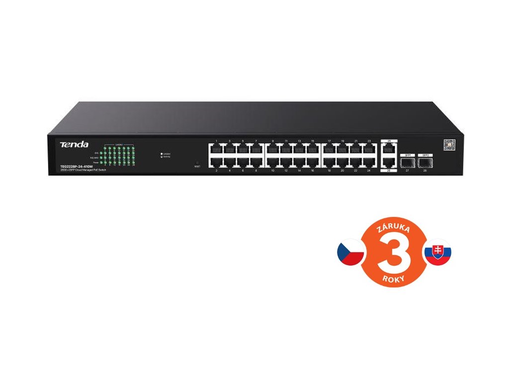 Tenda TEG2228P-24-410W je 26ti portový Gigabitový PoE L2 Websmart + Cloud switch. 24x 10/100/1000 Mb/s PoE 802.3af/at (celkem 370W) + 2x SFP 1000Mb/s. Podporuje webový + cloud management, QVLAN, IGMP, DHCP snooping, DHCP client, IGMP fast leave, Storm control, Anti-ring, Speed limit, Port mirroring + aggregation. Rackmount. Součástí balení je český, slovenský a polský manuál. Technické parametry Způsoby umístění: do racku (rackmount), na stěnu, desktop Standarty&protokoly: IEEE802.3, IEEE802.3u, IEEE802.3ab, IEEE802.3af, IEEE802.3at, IEEE802.3z, IEEE802.3x, IEEE802.1p, IEEE802.1q LED Indikace: 24x Link/Act, 3x PWR/SYS/PoE max LED Porty: 24x 10/100/1000 Base-T (PoE + data), 2x 10/100/1000 Base-T (data), 2x 1000 Base-X SFP Level přepěťové ochrany: - pro porty: 6kV, - pro napájení: 6kV Mód přepínání: Store-and-forward Celková propustnost: 56 Gbps Přepínání paketů: 41,7Mpps MTBF: 50 000+ hod. Velikost tabulky MAC adresace: 8K Napájení: ze sítě 100-240V AC 50/60Hz Rozměry zařízení: 440mm x 240mm x 44mm(L*W*H) Pracovní teplota: 0oC ~ 45oC Vlhkost: 10%-90%RH (nekondenzující) Certifikace: CE/RoHS VLAN: - Support VLAN transparent transmission, - Support IEEE 802.1Q VLAN, Port properties: - Support port flow control, - Support port isolation, - Support N:1 port mirroring, - Support ports statistics of received and transmitted packets, conflict packets and CRC error packets Spped limit: - Support port entrance and exit speed limit Anti-ring / Loop guard: - Support switch port loop protection QoS: - Support strict priority, - Supports weighted priority, MAC: - Support MAC address table viewing - MAC whitelist binding Storm control: - Support storm control on ports Upgrade, import, export: - Support HTTP upgrade and configuration import/export IGMP: - Supports IGMP fast leave, - Support IGMP Report Suppression DHCP: - Support DHCP Client, - Support DHCP Snooping, PoE: - Support PoE power display - Support PoE on and off - Support PoE timing Watchdog: - 7/24 hours automatic operation and maintenance Management and maintenance: - Support CloudFi App management, - Support Cloud web UI management, - Support local web UI management, - Support ping test
