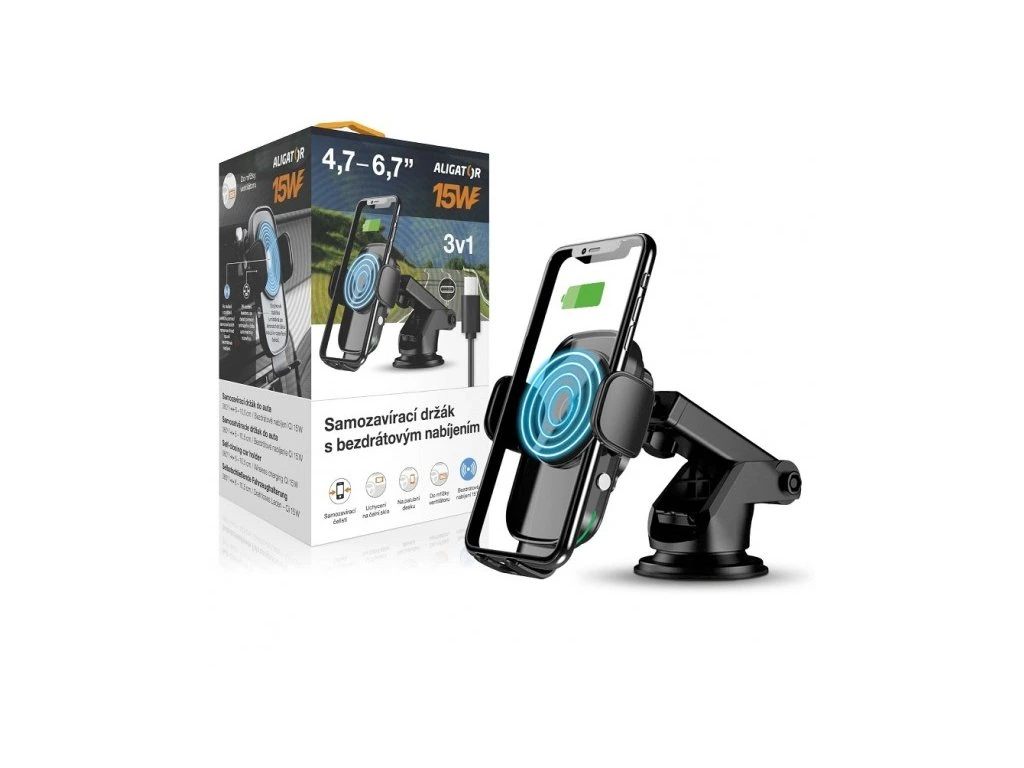Samozavírací držák do auta s bezdrátovým nabíjením Aligator 3v1. Rychlé bezdrátové nabíjení chytrého telefonu o výkonu 15W a samozavírací ramena, která pomocí snímače automaticky sevřou mobilní telefon a zajistí ho v nejlepší možné poloze pro nabíjení.