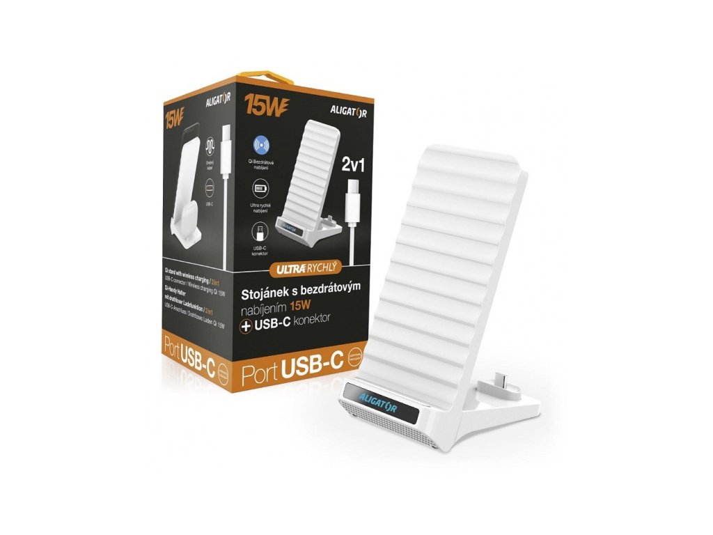 ALIGATOR Stojánek s bezdrátovým nabíjením 15W a USB-C konektorem, 2v1, bílý
