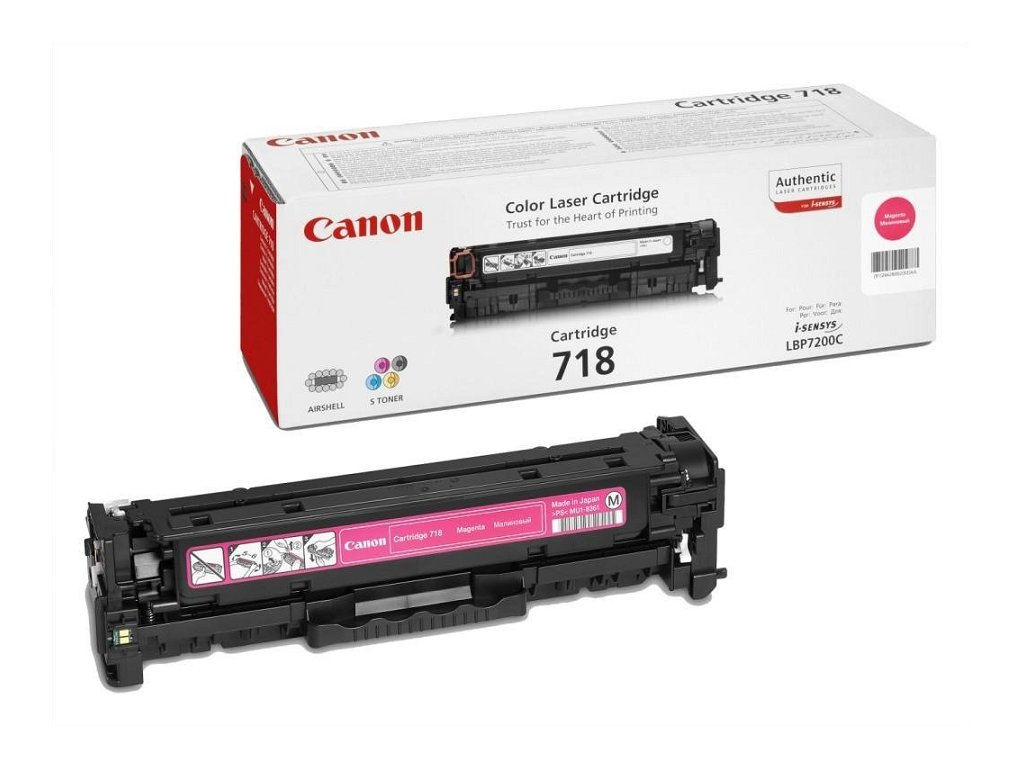 Toner Canon CRG-718 Magenta je určen pro vybrané barevné laserové tiskárny Canon. U tiskáren je zajištěn vysoce kvalitní výstup v rozlišení 600×600 dpi, jež lze zvýšit na ekvivalentní rozlišení 9600×600 dpi pomocí funkce automatického zdokonalení obrazu (AIR – Automatic Image Refinement). Toner CRG-718 magenta obsahuje purpurovou barvu a udává se pro něj výdrž až cca 2900 stránek, při standardním 5% pokrytí.